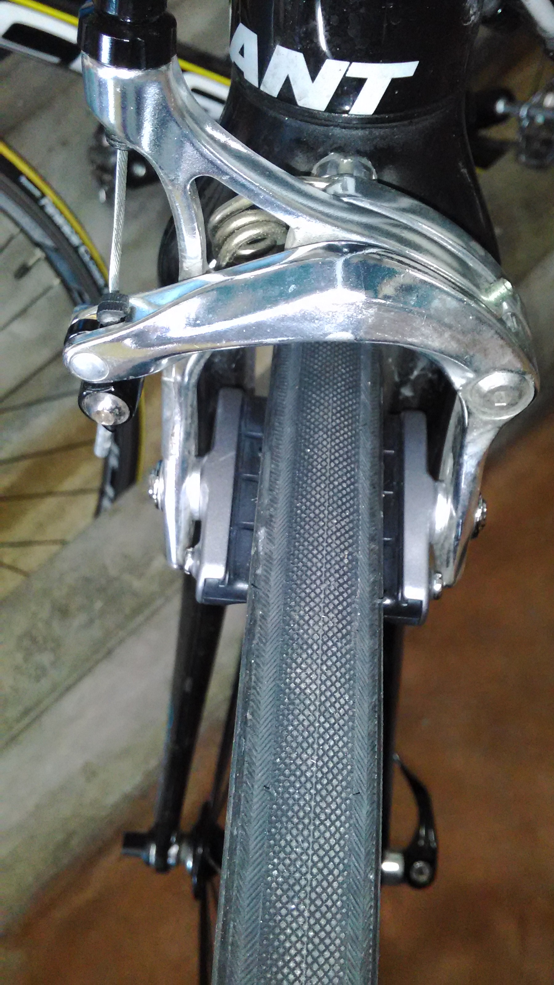 太いタイヤでも履けるようにするためだと思うのですが、ブレーキアーチが長いロングアーチのものをつけられています。そのため、通常のロード用ブレーキはつけられません。